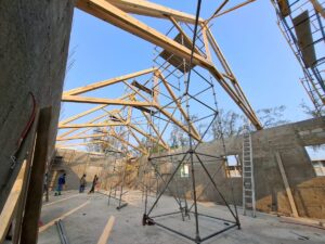 Un ejemplo de esta intervención es el salón de usos múltiples, donde el estructurista Mario Orlando Ricalde Camacho, especialista en tecnología de la madera, ha diseñado meticulosamente esta área, utilizando la madera como elemento central para realzar el espacio donde se llevarán a cabo eventos de gran importancia para la comunidad.